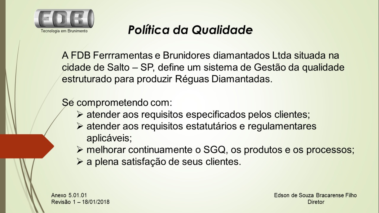 A Diretoria da FDB assegura que os requisitos dos clientes são determinados e atendidos através da melhoria contínua da qualidade, de capacitação de seus funcionários e relacionamento cliente-organização-fornecedor, cujo propósito é aumentar a sua satisfação.
